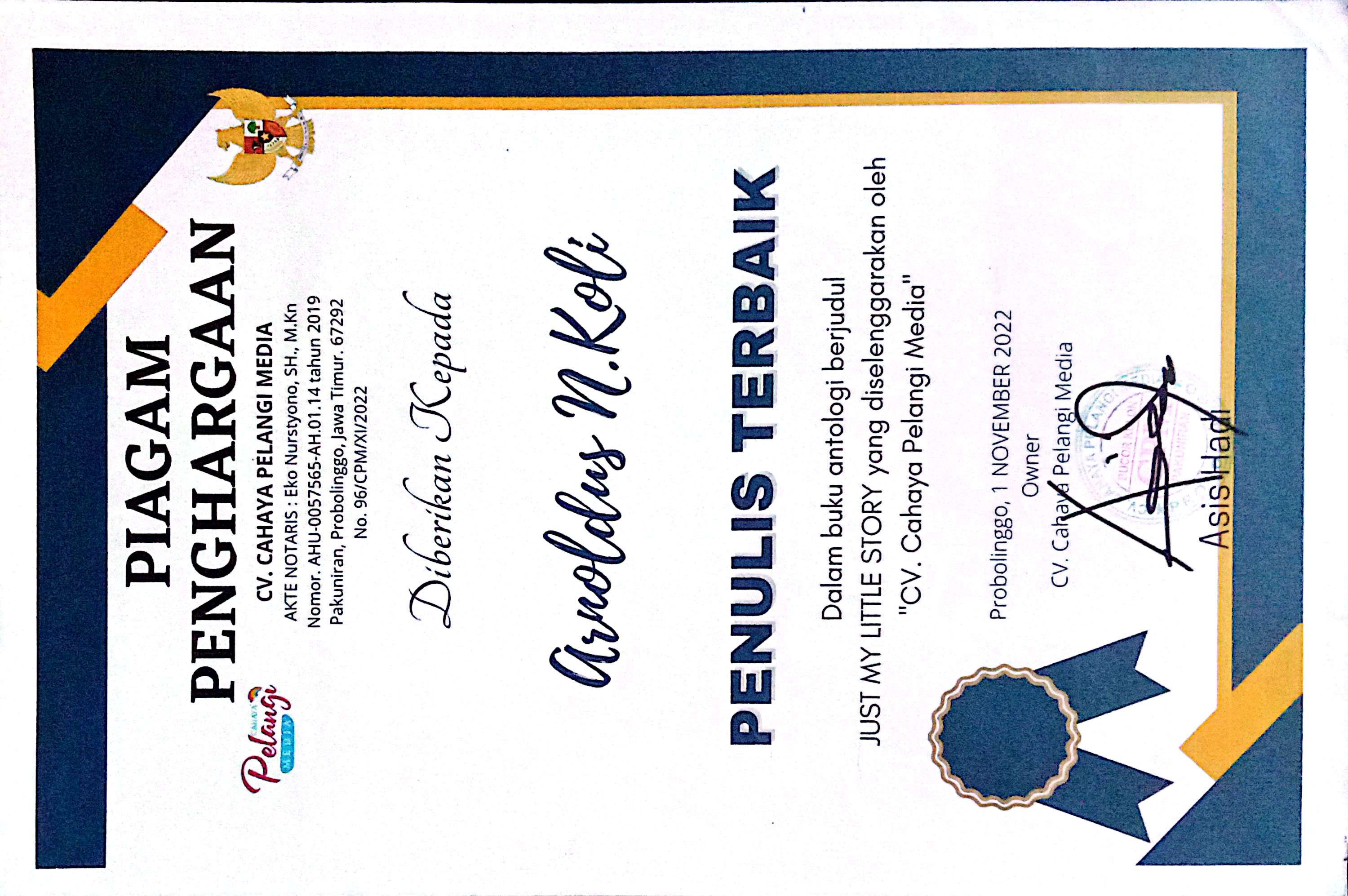 KOLI, Arnoldus Nofrianus Piagam penghargaan sebagai penulis Terbaik dalam Antologi Buku Antologi Cerpen yang diselenggarakan oleh CV. Cahaya Pelangi Media. [Image] (Unpublished)