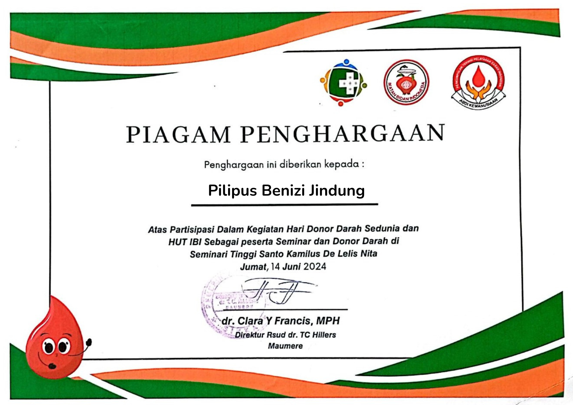 JINDUNG, Pilipus Benizi Sertifikat Penghargaan Atas Partisipasi dalam Kegiatan Donor Darah Sedunia dan Hut IBI. [Image] (Unpublished)